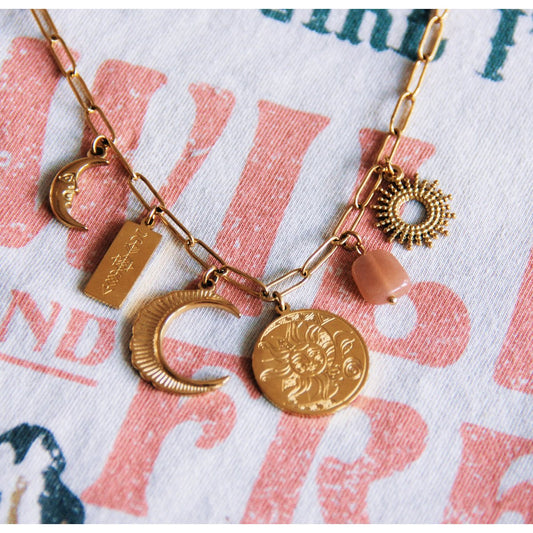 Edelstalen fijne ketting met bolletjes met maan/zon bedel – goud